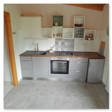 - Voll ausgestattete Küchenzeile (2-Flammen, Kühlschrank m. Gefrierfach, Koch- & Essgeschirr)