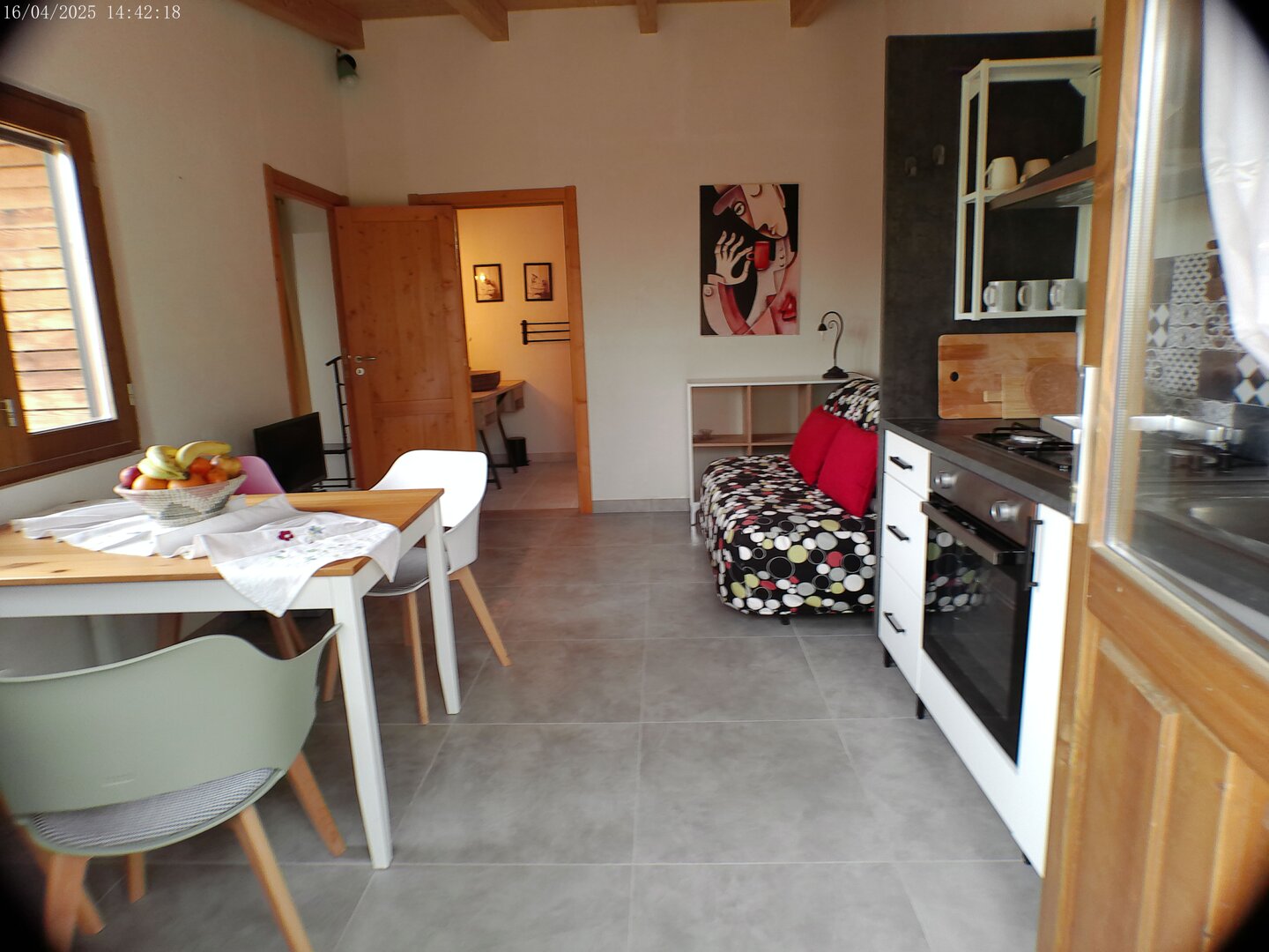 - Küche: 2-Flammen-Kochfeld, Kühlschrank mit Gefrierfach, Wasserkocher, Mokka, Töpfe, Pfannen, Geschirr, Grundgewürze