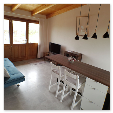 Ein Haus als Einzelhaus ideal für Paare oder kleine Familien: 1 Schlafzimmer (Doppelbett) + Schlafsofa im Wohnbereich, 1 Bad mit ebenerdiger Dusche, Wohn-/Essbereich mit Küchenzeile, private Terrasse, Parkplatz.